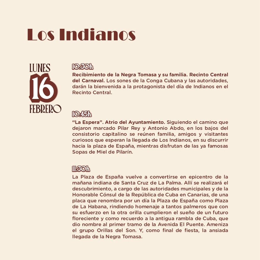 La Plaza de España vuelve a convertirse en epicentro de la mañana indiana de Santa Cruz de La Palma. Alli se realizará el descubrimiento a cargo de las autoridades municipales y de la Honorable Cónsul de la República de Cuba en Canarias, de una placa que renombra por un día la Plaza de España como Plaza de La Habana, rindiendo homenaje a tantos palmeros que con su esfuerzo en la otra orilla cumplieron el sueño de un futuro floreciente y como recuerdo a la antigua rambla de Cuba, que dio nombre al primer tramo de la Avenida El Puente.